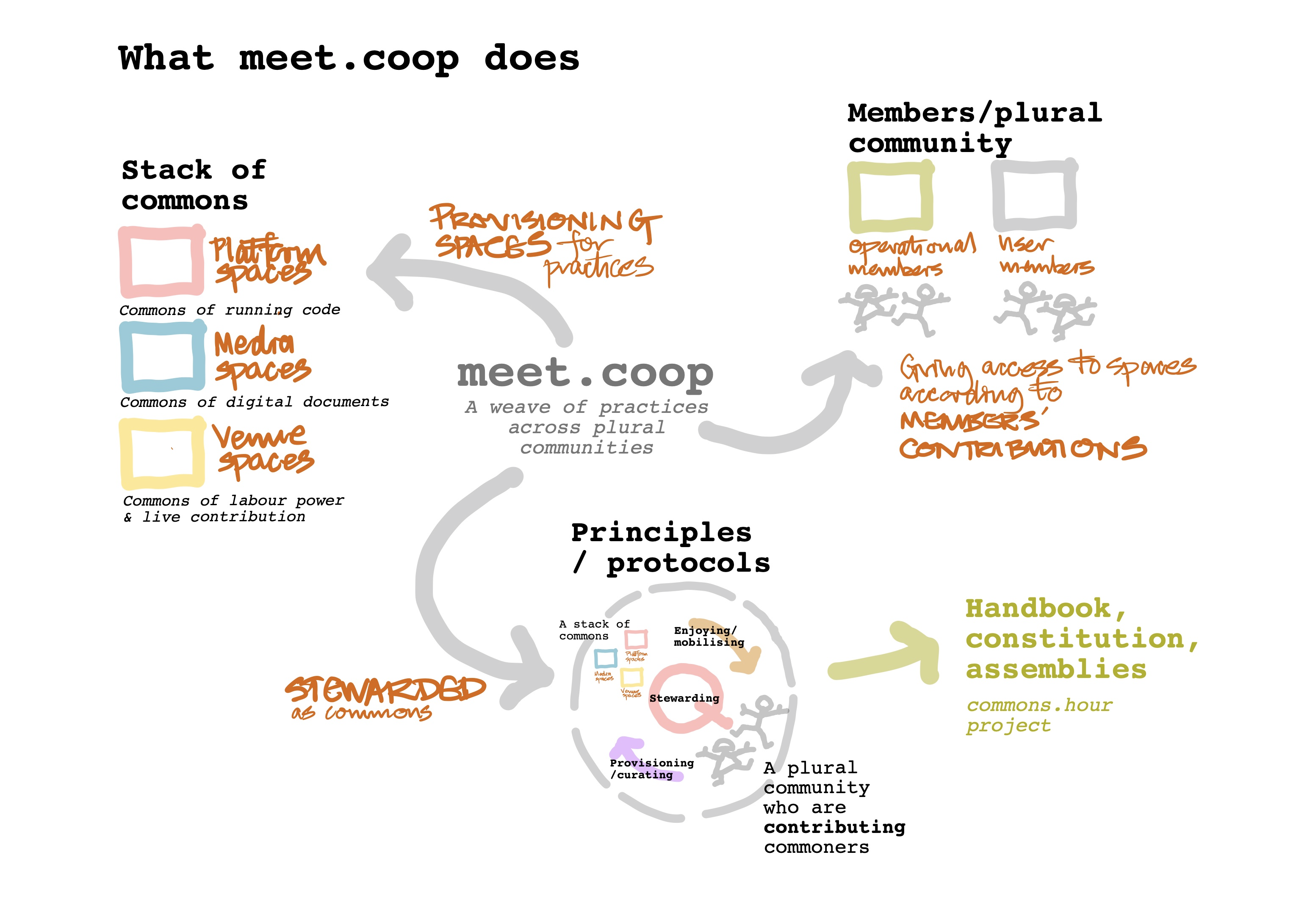 In this section we underpin the vision, mission and βstyleβ of meet.coop. This involves a framework of: - Mission & vision - Spaces - The digitally mediated spaces that we steward for and with our members, as forces of production that can be safely, reliably and fluently mobilised by organisers in the coop-commons economy and civil society. - Commoning - The commitment of commoning, and specifically of **stewarding** in commons, as a transformational politics of dual power, and a radical mode of provisioning means of subsistence and wellbeing in a coop-commons economy - Principles & protocols -The framings that we adopt as the basis of our working practice, in provisioning, enjoying and stewarding spaces. This includes the values that we embody and propagate in our practice, and our collective intentions for transformed society and community.
