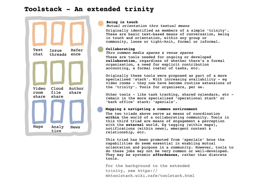 Digital toolstack - Here we bring up a framework about tools, arising from a decade or so of experimentation. It has three phases: trinity, stack and 'specials'.
